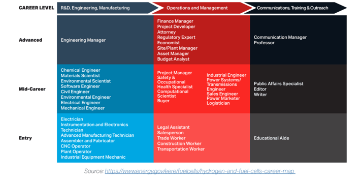 Tại Hoa Kỳ, một nghiên cứu năm 2019 dự báo 42 nghề mới trong ngành công nghiệp hydro mới nổi, nhấn mạnh nhu cầu về các kỹ năng và giáo dục khác biệt so với các công việc hiện có.