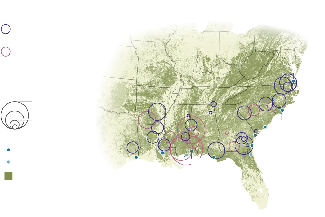 Sông Cape Fear của Bắc Carolina rải rác các cơ sở công nghiệp, cần cẩu, thùng chứa, tàu lớn và những cây bách cổ thụ có rễ lớn neo trong nước. Gần cửa sông, hai mái vòm màu trắng, mỗi mái vòm có khả năng chứa 45.000 tấn gỗ, sừng sững trên bờ sông.