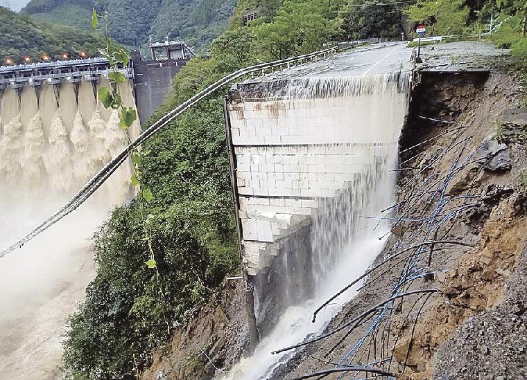 Quốc lộ 327 chạy quanh đập Tsukahara (thị trấn Misato, tỉnh Miyazaki) bị sập và bị cắt đứt do bão số.