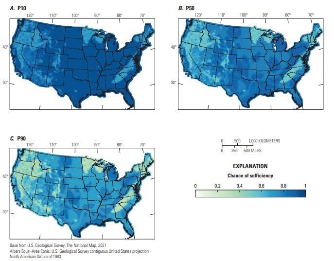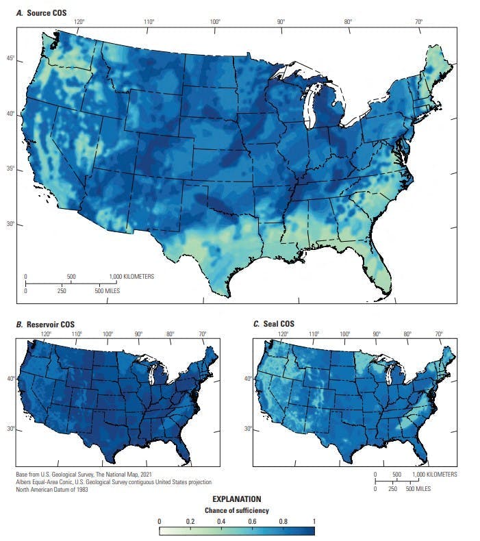 Một bản đồ triển vọng mới của USGS đánh giá những khu vực nào có các điều kiện địa chất cần thiết—nguồn hydro, đá chứa và lớp niêm phong để giữ khí—để tích tụ hydro. Bản đồ chỉ định các giá trị triển vọng tương đối từ 0 đến 1 và các khu vực có giá trị cao hơn (màu xanh lam đậm trên bản đồ) có triển vọng hơn; có khả năng chứa hydro địa chất tích tụ cao hơn các khu vực có giá trị thấp hơn.