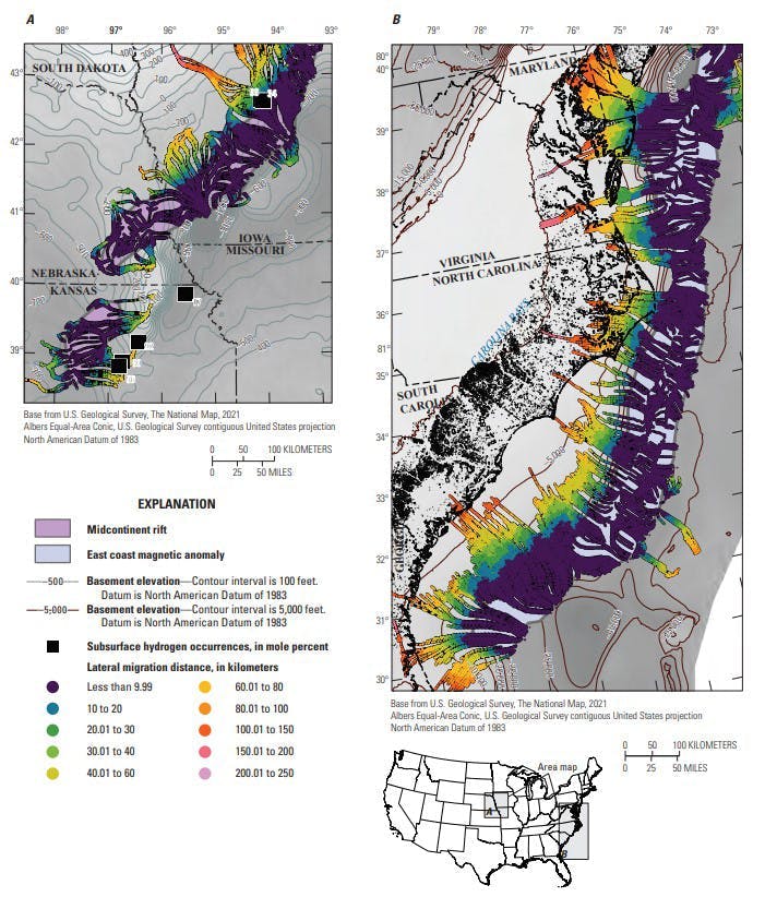 Trong phạm vi Hoa Kỳ, hydro gần đây đã được báo cáo ở Arizona, California, Kansas, Montana và Nebraska. Các quan sát về hydro ở nồng độ hơn 0,5 mol% được thể hiện trong Hình 1, minh họa cho sự phân tán chung của các lần xuất hiện hydro trên khắp Hoa Kỳ.