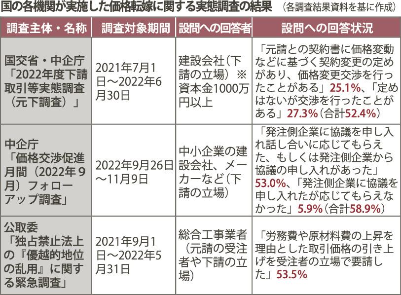 Theo một cuộc khảo sát khẩn cấp của Ủy ban Thương mại Công bằng, 87,1% tổng thầu được yêu cầu tăng giá giao dịch từ quan điểm của bên đặt hàng. Có một khoảng cách giữa tỷ lệ được yêu cầu từ quan điểm của nhà thầu và ngay cả khi các nhà thầu phụ và nhà sản xuất yêu cầu tăng giá giao dịch, tình hình thực tế xuất hiện là những người đặt hàng tư nhân như nhà thầu chính và nhà phát triển ở phía đặt hàng đã không thể làm như vậy. JFTC chỉ ra rằng, bất kể có yêu cầu từ nhà thầu phụ hay không, v.v., hành động giữ nguyên giá giao dịch mà không thảo luận về việc phản ánh việc tăng chi phí trong đàm phán giá có thể dẫn đến các vấn đề như lạm dụng quyền hạn của cấp trên. vị trí thương lượng.