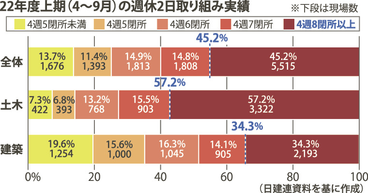 Liên đoàn các nhà thầu xây dựng Nhật Bản (Nikkenren, Chủ tịch Yoichi Miyamoto) đã tóm tắt tình hình sáng kiến nghỉ hai ngày mỗi tuần tại công trường của các công ty thành viên. Theo một cuộc khảo sát được thực hiện trong nửa đầu năm tài chính 2022, 45,2% trong số 12.205 nơi làm việc đã đóng cửa 8 lần trở lên trong 4 tuần, tăng 4,4 điểm phần trăm so với cùng kỳ năm ngoái. Theo cuộc khảo sát được thực hiện lần đầu tiên, 80,1% trong số 53.866 công nhân được khảo sát đã nghỉ từ 8 ngày trở lên trong 4 tuần, cho thấy rằng công ty đang phát triển một môi trường mà nhân viên có thể nghỉ nhiều ngày theo ca và các cách khác.