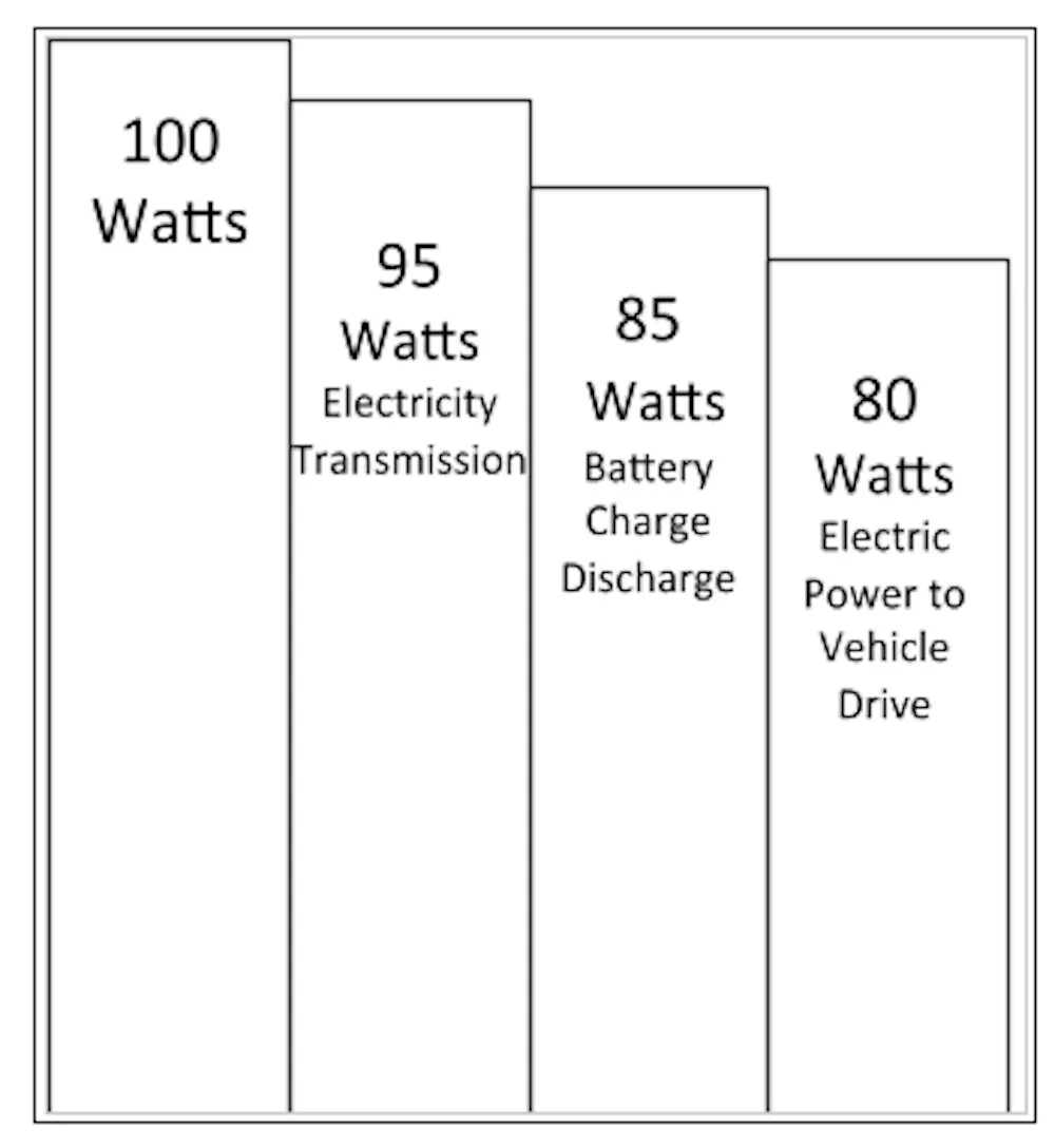 Bạn mất thêm 10% năng lượng từ việc sạc và xả pin lithium-ion, cộng thêm 5% năng lượng từ việc sử dụng điện để di chuyển xe. Vì vậy, bạn giảm xuống còn 80 watt – như thể hiện trong hình đối diện.