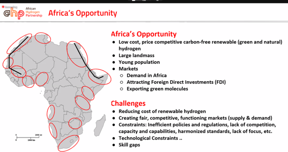 A transition slide showed how Africa’s short-term goal will be on growing its domestic markets, followed by attracting FDI in the medium term and exporting green molecules in the long term. Other slides showed developments among front-runners such as Namibia, Morocco, Egypt, Mauritania and South Africa, but many more countries need to be engaged across the continent.