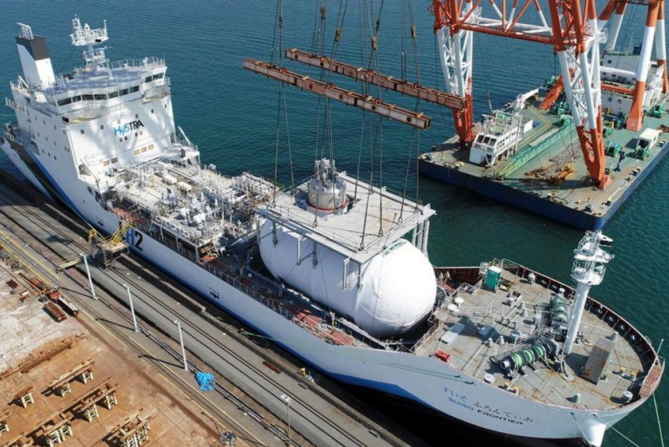 Hãng vận chuyển LH 2 hiện có duy nhất trên thế giới , Suiso Frontier của Kawasaki Heavy Industries , đã vận chuyển hydro có nguồn gốc từ than đá từ Úc đến Nhật Bản, chỉ có thể chứa 1.250 mét khối.