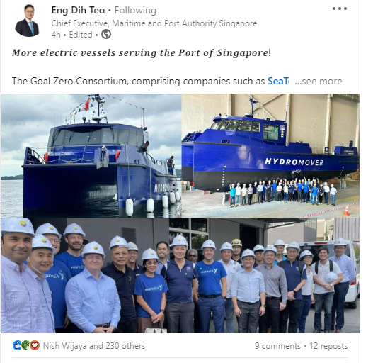 Hiệp hội Goal Zero, bao gồm các công ty như SeaTech Solutions International (S), Shift Clean Energy và Yinson GreenTech, đã hạ thủy tàu chở hàng chạy hoàn toàn bằng điện đầu tiên của Singapore, Hydromover.