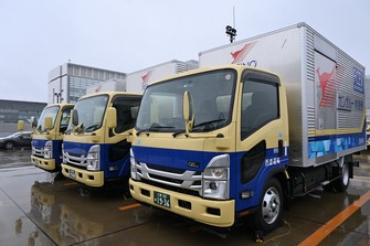 Những chiếc xe tải chạy bằng pin nhiên liệu hydro nhỏ được đưa vào sử dụng tại chi nhánh Fukagawa của công ty hậu cần Seino Transportation Co. vào tháng 3 này được nhìn thấy vào ngày 26 tháng 3 năm 2024, tại Phường Koto của Tokyo. Những chiếc xe tải đi nhận và giao hàng ở các quận trung tâm sầm uất của Tokyo bao gồm Ginza và Akihabara. (Mainichi/Seiho Akimaru)