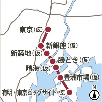 Bảy ga mới (tên ga đều là dự kiến) là ▽Tokyo, Shin-Ginza, Shinshinchi, Kachidoki, Harumi, Toyosu Market, Ariake và Tokyo Big Sight. Trong số này, Ga Harumi dự kiến sẽ loại bỏ các lô đất trống của đường sắt và được sử dụng làm ga gần nhất đến chung cư "Cờ Harumi", nơi từng là làng của các vận động viên. Với mục tiêu sinh lời trong vòng 30 năm kể từ khi khai trương.