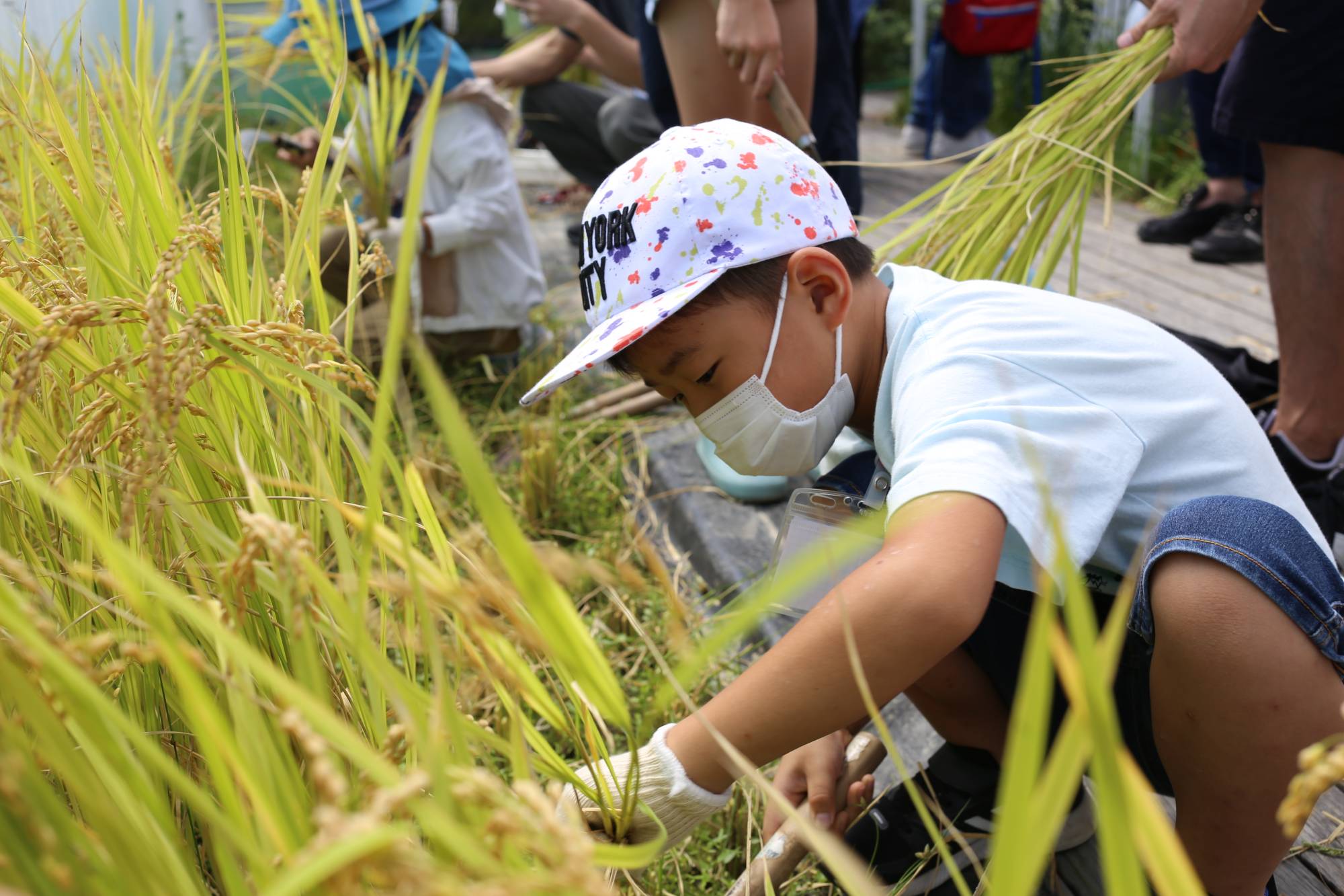 A boy harvests rice on the roof of the Miyako Ecology Center in Kyoto. | COURTESY OF THE MIYAKO ECOLOGY CENTER