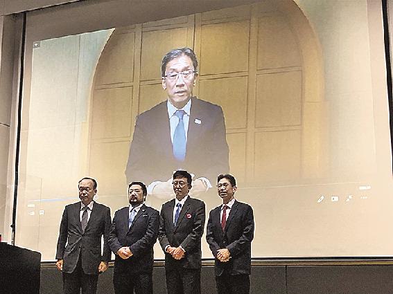 Giám đốc Meguro (thứ hai từ trái sang) và Giám đốc Okabe (thứ ba từ trái sang) chụp ảnh kỷ niệm