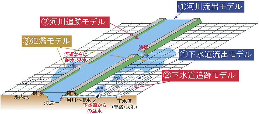 During heavy rains, flooding occurs continuously and complexly from large rivers, small and medium rivers, and sewers, but the conventional analysis model calculated these separately. For this reason, effective inundation measures and evacuation plans are effective in cases where large-scale flooding occurs from the main river after the occurrence of flooding in small and medium-sized rivers, and in cases where evacuation routes cannot be secured due to flooding from the sewage system even before the river floods. was difficult.