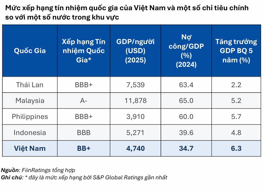 Nền tảng kinh tế vĩ mô của Việt Nam mạnh ở một số khía cạnh nhưng vẫn còn yếu ở những điểm khác. GDP bình quân đầu người năm 2025 đạt 4.740 USD, trong khi tỷ lệ nợ chính phủ trên GDP chỉ 34,7% – mức thấp nhất trong khu vực so với Indonesia (39,6%), Philippines (60%) và Malaysia (65%). Tăng trưởng GDP trung bình 5 năm đạt 6,3%, cao hơn tất cả các nước trong nhóm so sánh tại ASEAN.