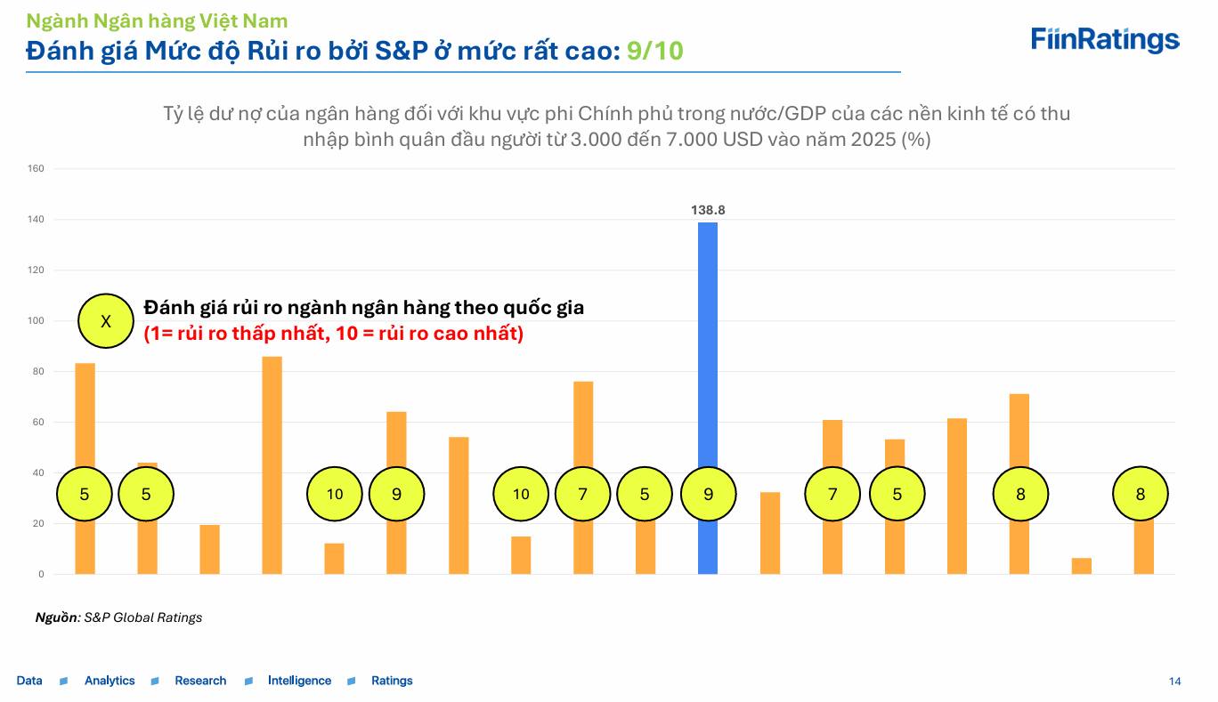 Ông Thuân chỉ ra những điểm nghẽn cơ cấu mà các tổ chức xếp hạng quốc tế đặc biệt quan tâm: hệ thống ngân hàng được đánh giá rủi ro “rất cao” (9/10 theo thang BICRA của S&P), tỷ lệ tín dụng trên GDP cao, và thị trường vốn còn nông. “Vai trò của thị trường trái phiếu doanh nghiệp vẫn quá hạn chế, và mối liên kết với hệ thống ngân hàng còn yếu”, ông nhận định.