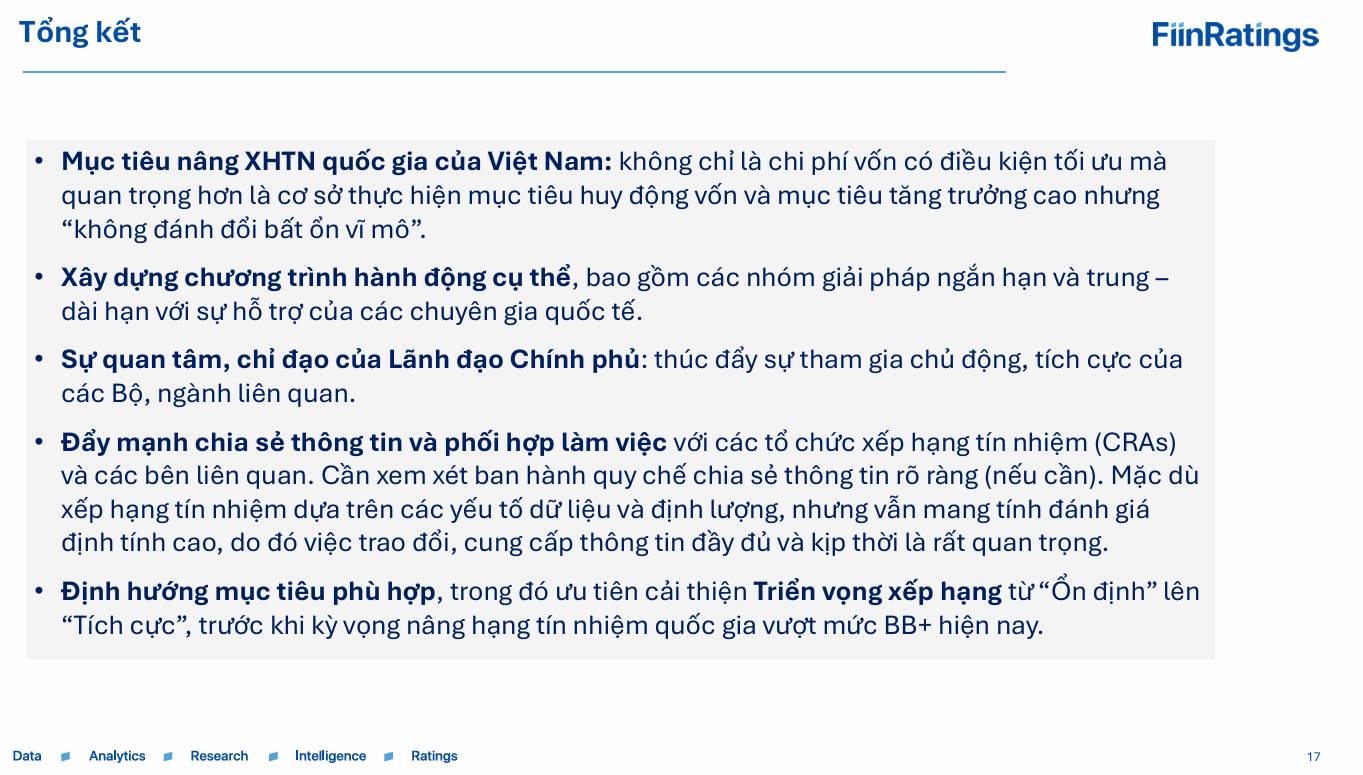 Ông Thuân kết luận rằng Việt Nam có những nguyên liệu thô cho một đợt nâng hạng: tăng trưởng cao, nợ chính phủ thấp, và vị thế đối ngoại tích cực – nhưng lại thiếu các khung khổ thể chế và minh bạch mà các tổ chức xếp hạng đánh giá cao.